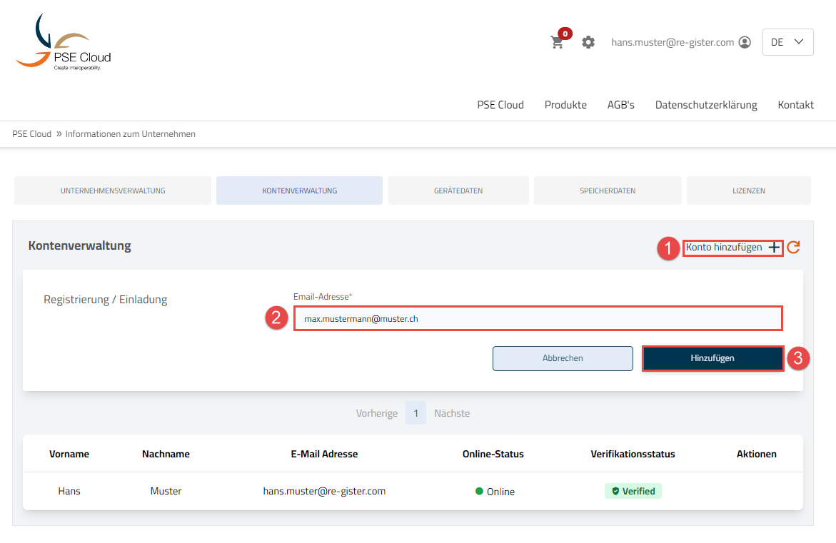 Loggen Sie sich auf dem PSE Cloud Portal ein und drücken Sie auf den Button Einstellungen. Gehen Sie unter Rubrik „Firmenverwaltung" und anschliessend auf den Reiter "Kontenverwaltung".