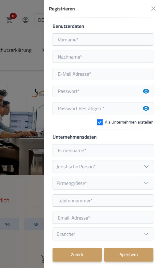 Geben Sie nun Ihre Daten ein. Falls Sie sich als Firma registrieren möchten, aktivieren sie das Kontrollkästchen "Als Unternehmen erstellen". Geben Sie hier Ihre Firmendaten ein.