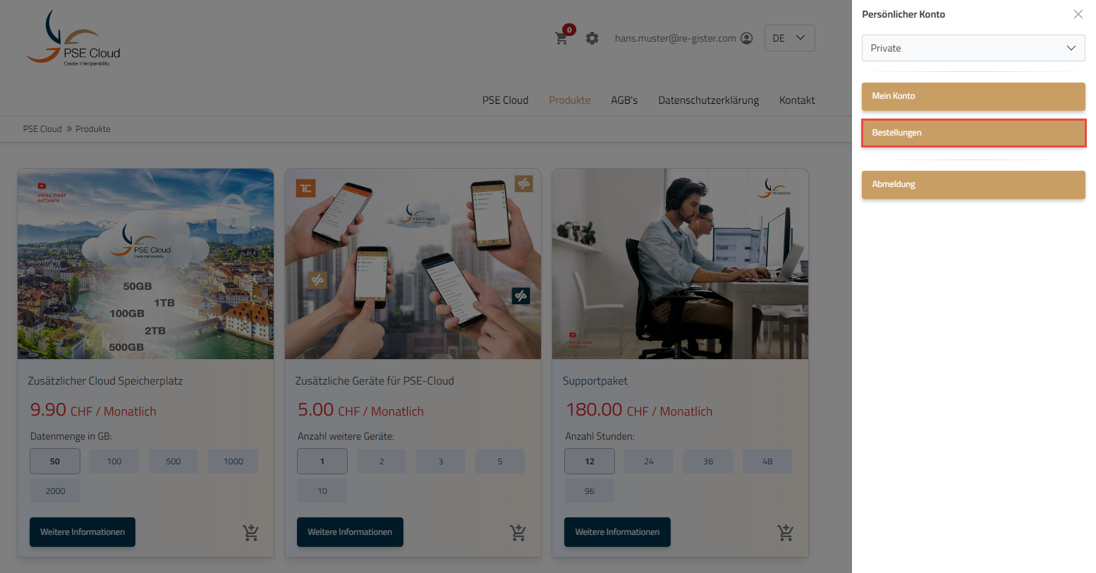 Loggen Sie sich auf dem PSE Cloud Portal ein und gehen Sie unter „Produkte“. Da können Sie zusätzlichen Datenspeicher kaufen.