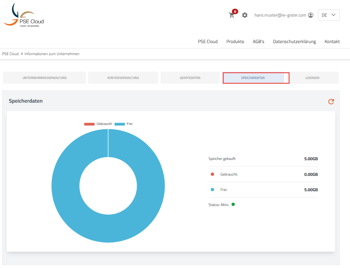 Loggen Sie sich auf dem PSE Cloud Portal ein und drücken Sie auf den Button Einstellungen. Gehen Sie unter Rubrik „Mein Konto“ und wählen Sie anschliessend den Reiter „Speicherdaten“, um Ihren aktuellen Datenspeicherplatz einzusehen.